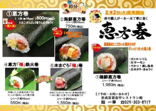 鮨一華 寿司職人が一本一本丁寧に巻いた恵方巻ご予約承り中です。