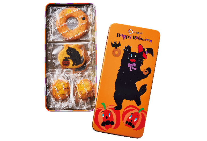 ハロウィン缶に、泉屋一番人気リングダーツ、かぼちゃ味のクッキー、かぼちゃ味のプリントクッキー