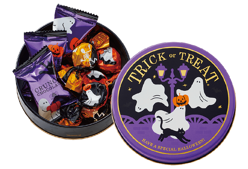 ハロウィーンデザインの缶に、ミルクチョコレートとクランチチョコレートを詰め合わせた楽しいスイーツです。