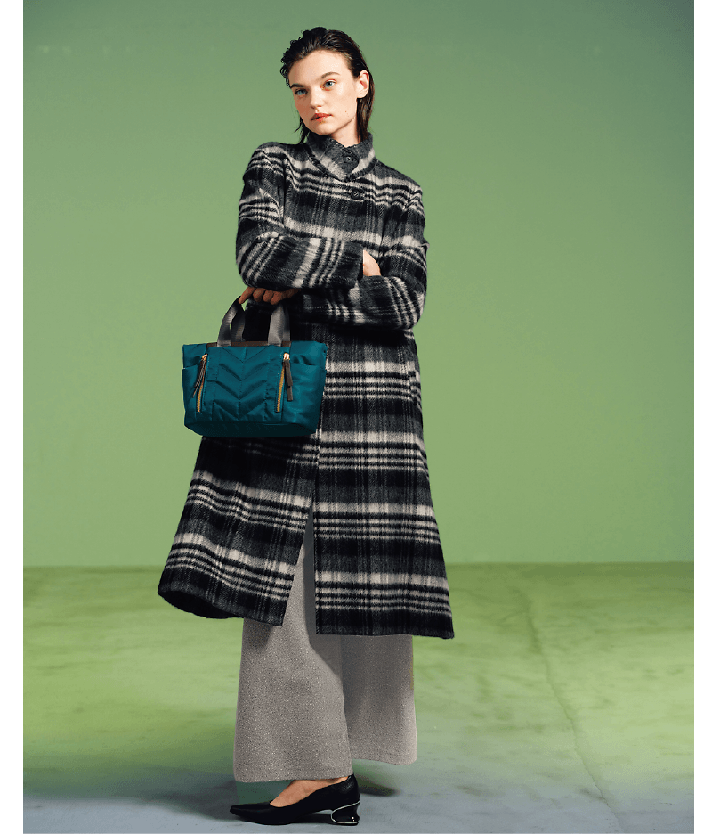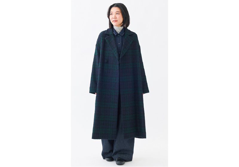 ループ糸を使用し、チェック柄が立体的に表現されたメルトン生地のロングコート。