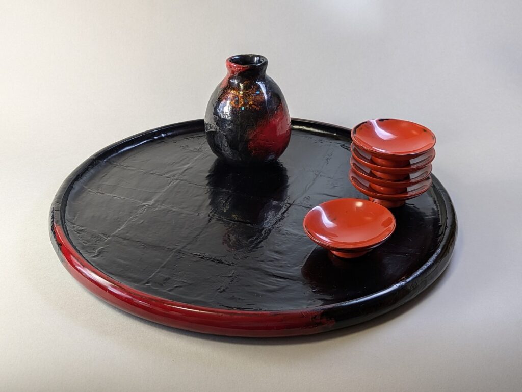 尺2寸布目丸盆、乾漆徳利、根来塗小盃