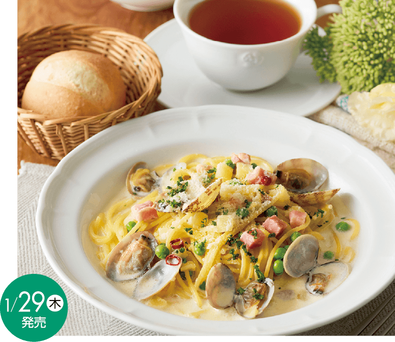 イタリア産ピゼリーニに、あさりとベーコンを合わせた旨みたっぷりのスープパスタ。