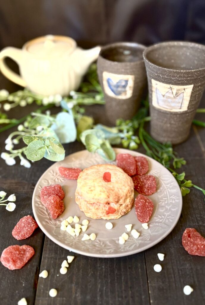 いちごと生クリーム、2種のスコーンの生地をマーブル状に合わせて、ホワイトチョコレートチップをプラスしました。