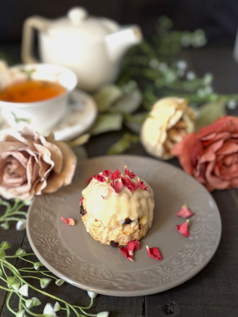食用の薔薇の花をスコーンに乗せて、薔薇の花ことば「愛と美と情熱」を表現しました。