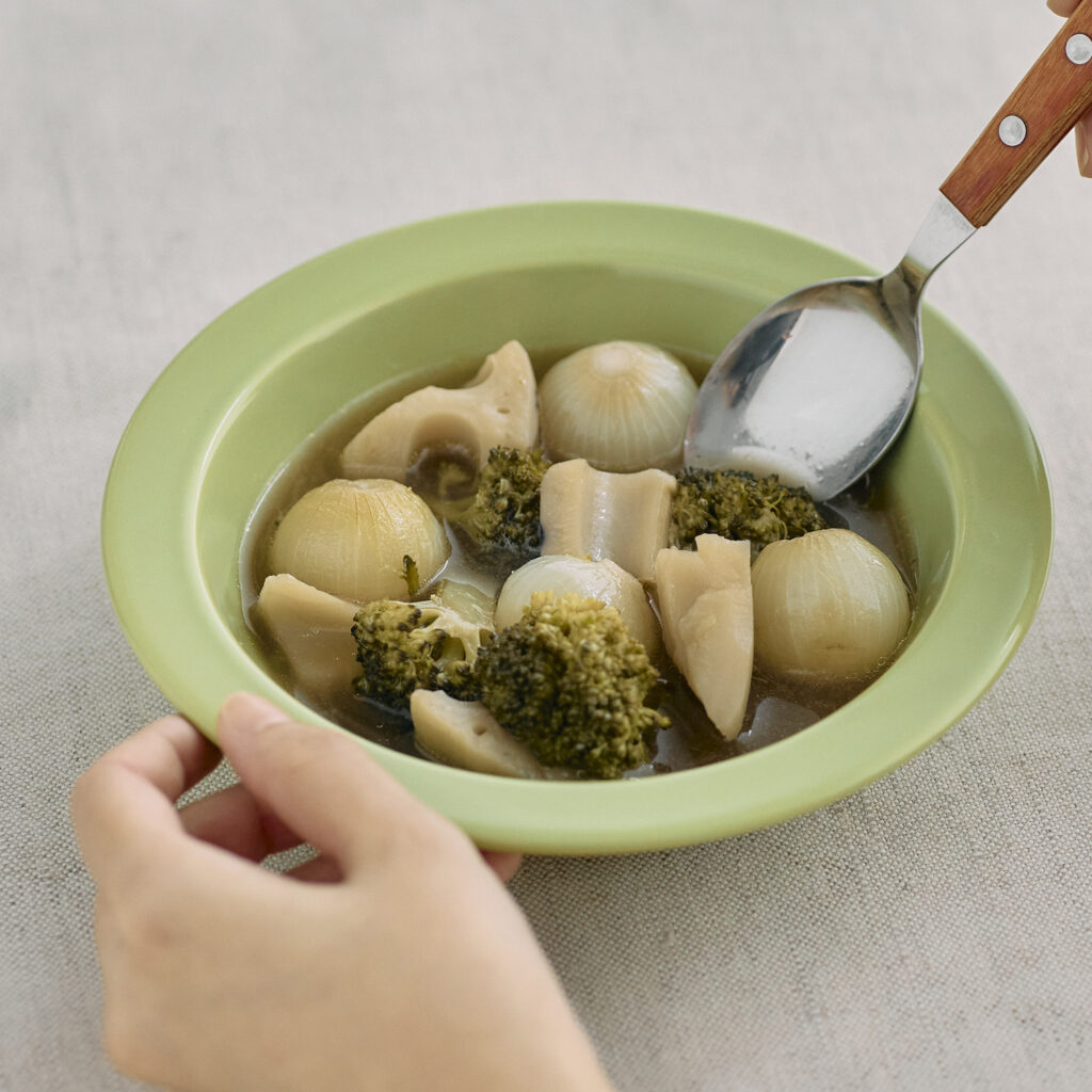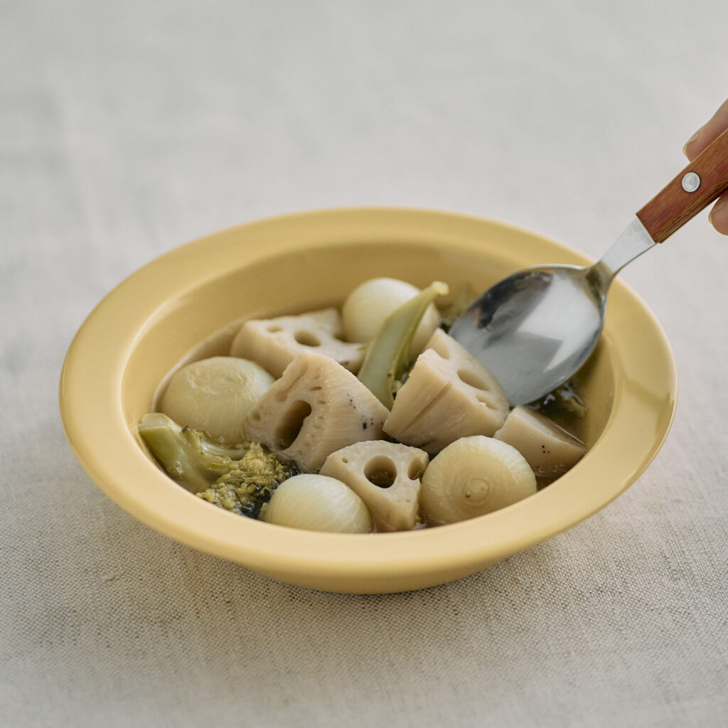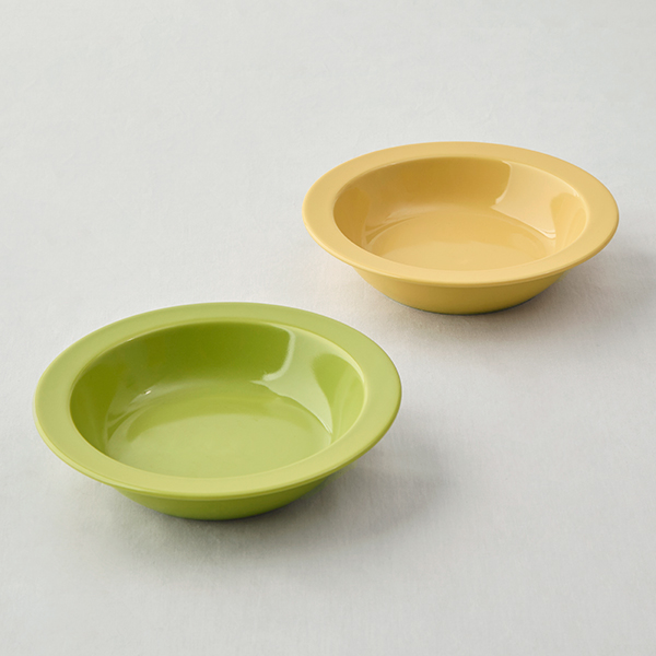 明るい黄色とライトグリーンの色合いが食卓を彩るリム付きのボウルは、スープやシチューはもちろんサラダや副菜のおかず皿として幅広く使えます。