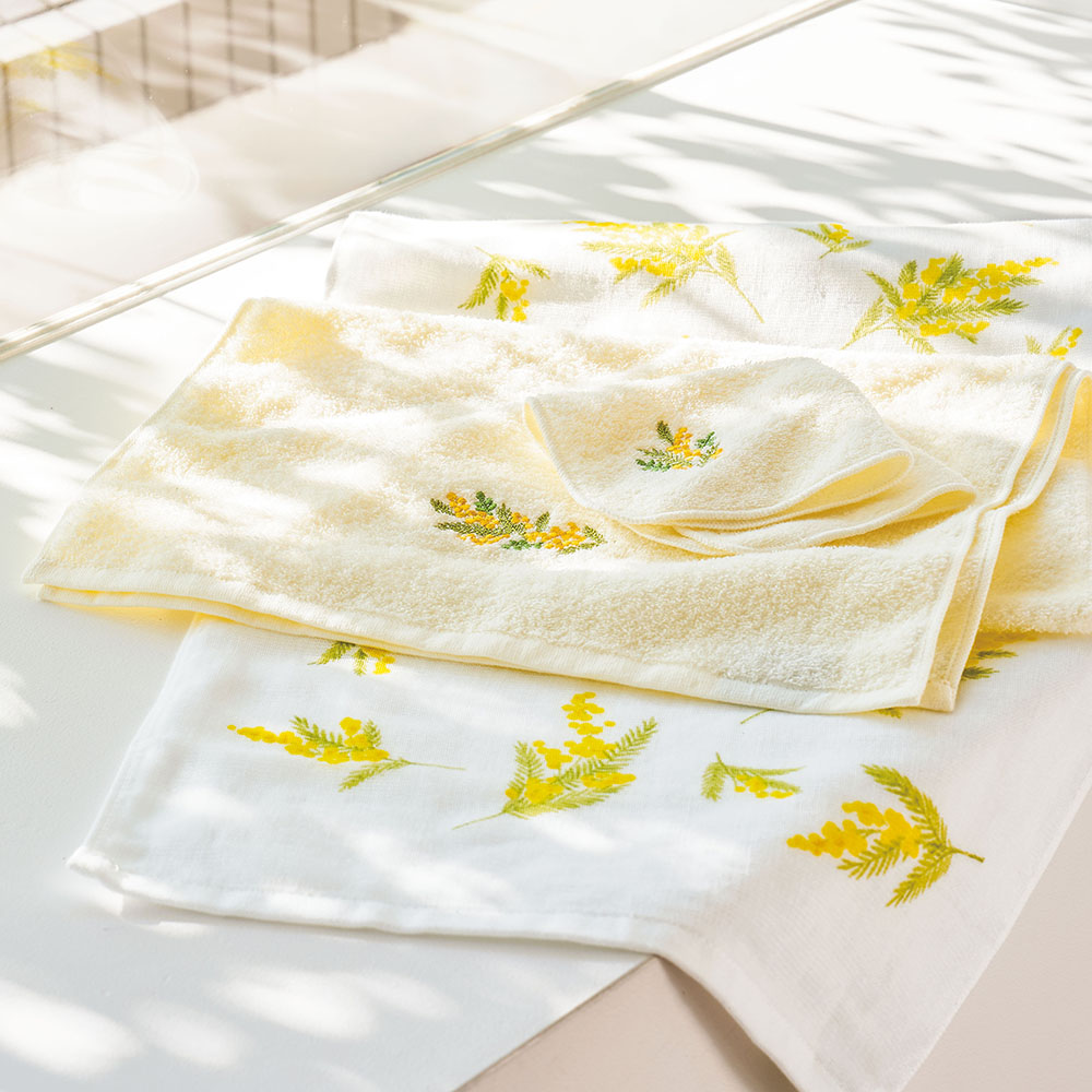 春の爽やかな季節にぴったりな明るく優しいプリント柄とワンポイントの刺繍が入ったフェイスタオルとハンカチです。