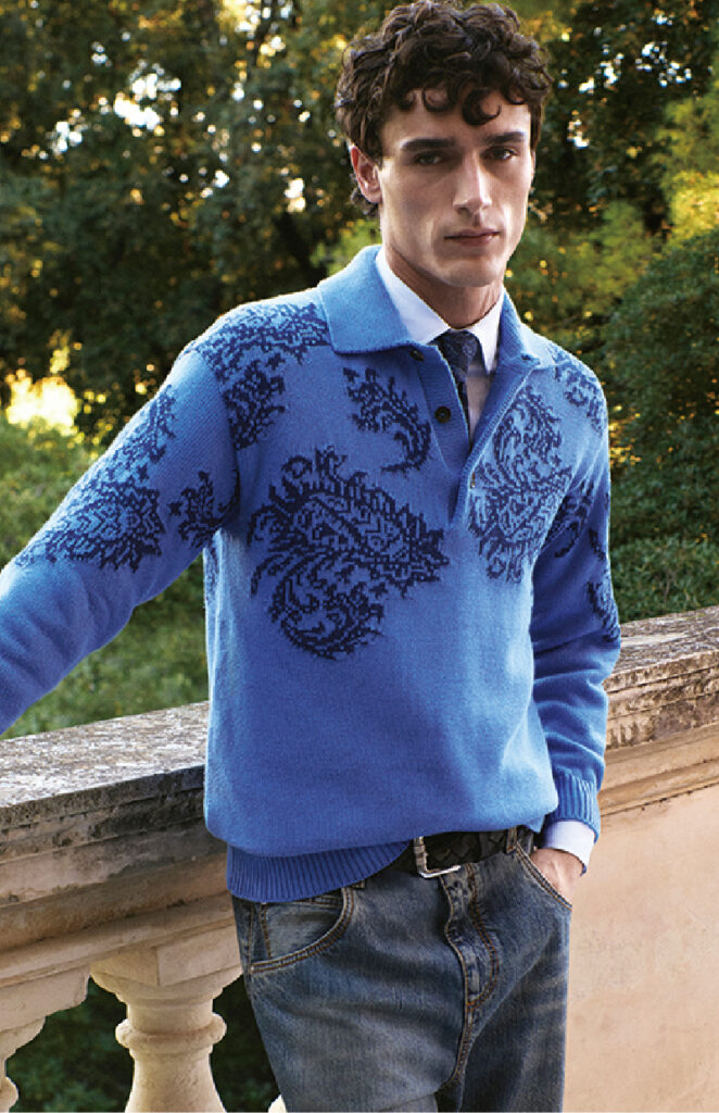 コットン100%のジャカード生地で作られた、ポロスタイルの襟付きセーター。