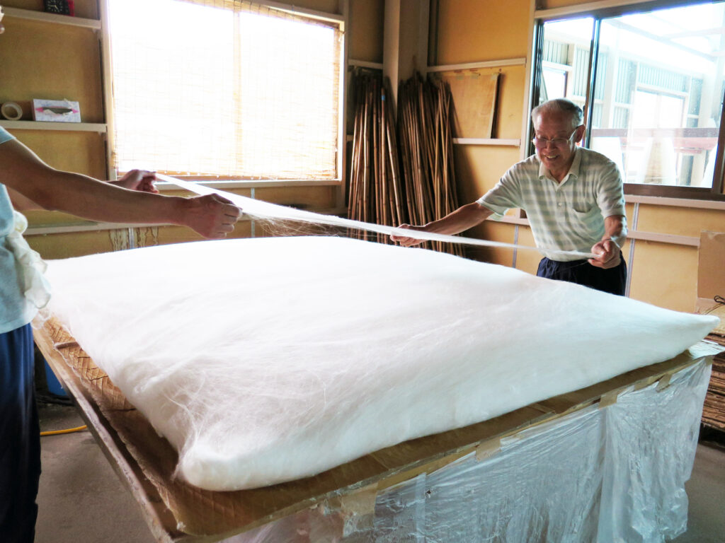 滋賀県の近江より職人を招き、角真綿を手挽きにて丹念に伸ばし、真綿布団を丁寧に作り上げる様子を是非ご覧ください。