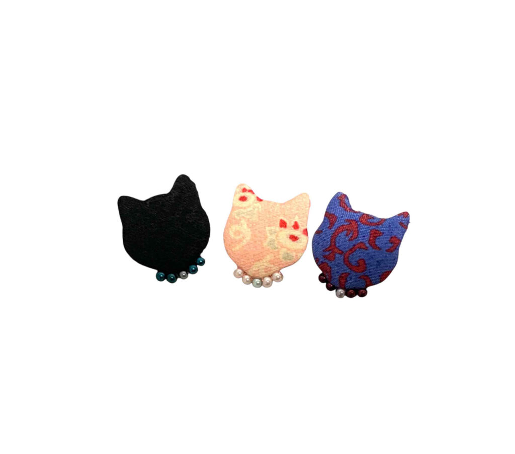 ビンテージ着物生地の猫型ピアスとイアリング