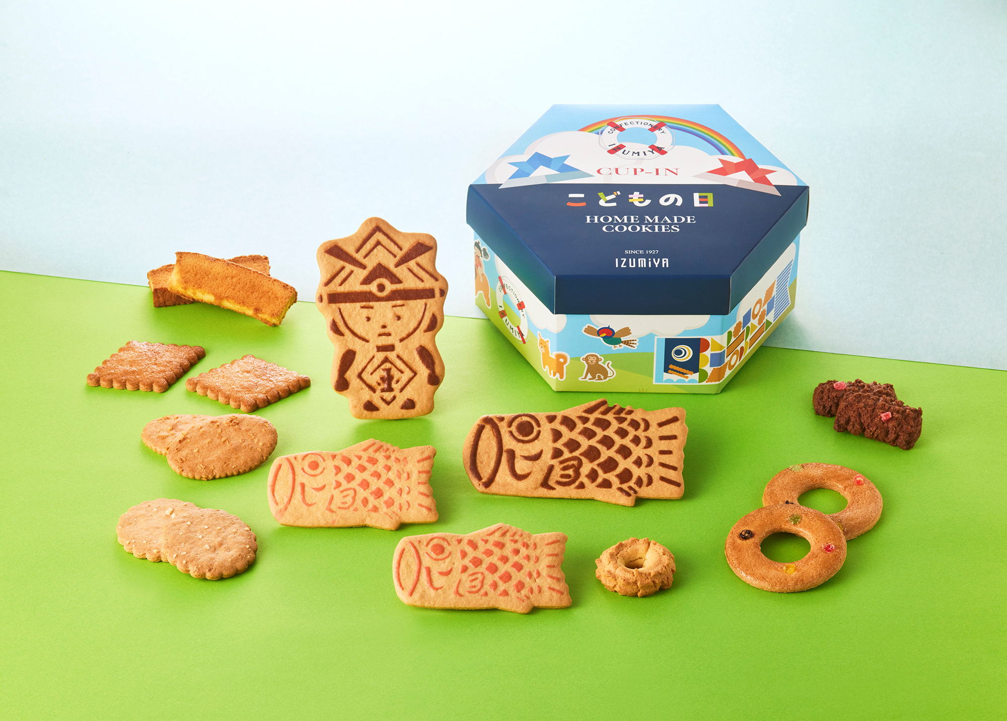 泉屋のシンボルマークの浮輪をかたどったリングターツと金太郎、鯉のぼりをかたどった可愛らしいクッキーなどを詰め合わせた子供の日限定商品です。