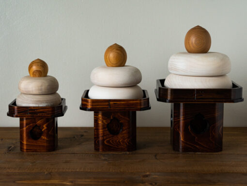 国指定の伝統工芸品、庄川挽物木地の技術で作る「木のお鏡餅」宝珠型の橙や漆塗りの三方などスタ…