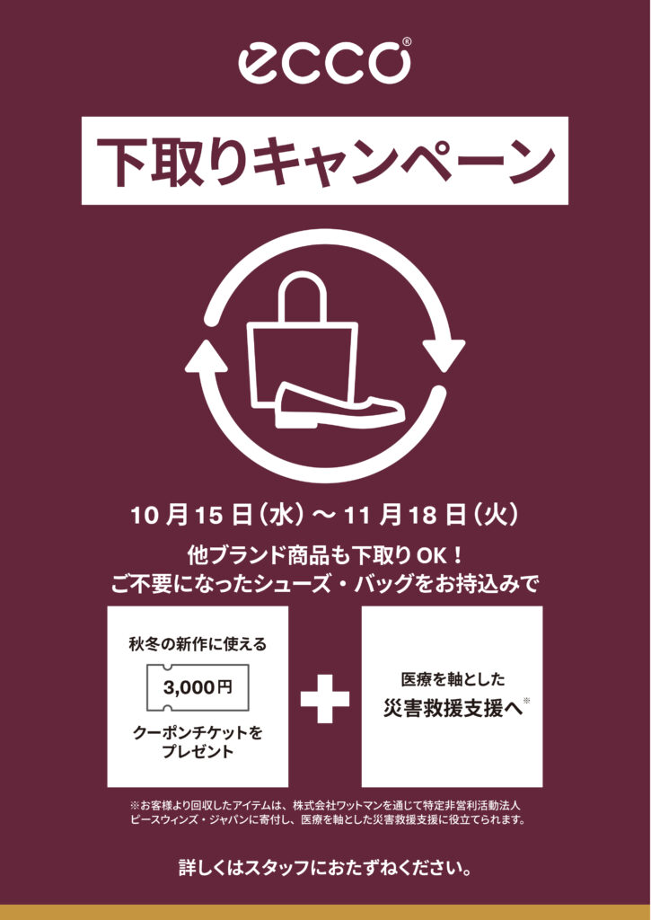 ご自宅で眠っているシューズ・バッグをお持ち込みで、エコー商品をお買い上げの際にご利用いただける3,000円のクーポンチケットをプレゼント致します。