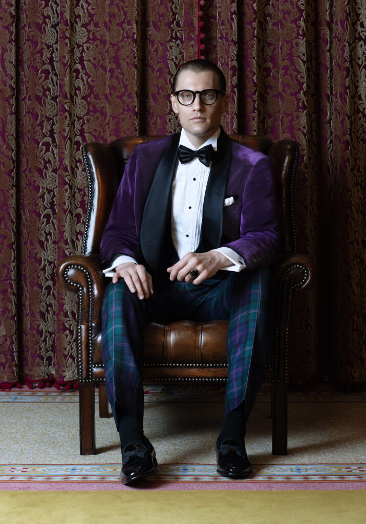 深く濃密なアメジスト色の服地と、端正なシルエットが、今宵の主人公に究極のエレガンスを纏わせる。