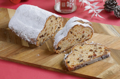 ドイツの伝統的なクリスマスのお菓子であるシュトレン。ドイツではイブまでの期間に薄くスライスして少しずつ食べながら楽しみにクリスマスを待つ習慣があります。