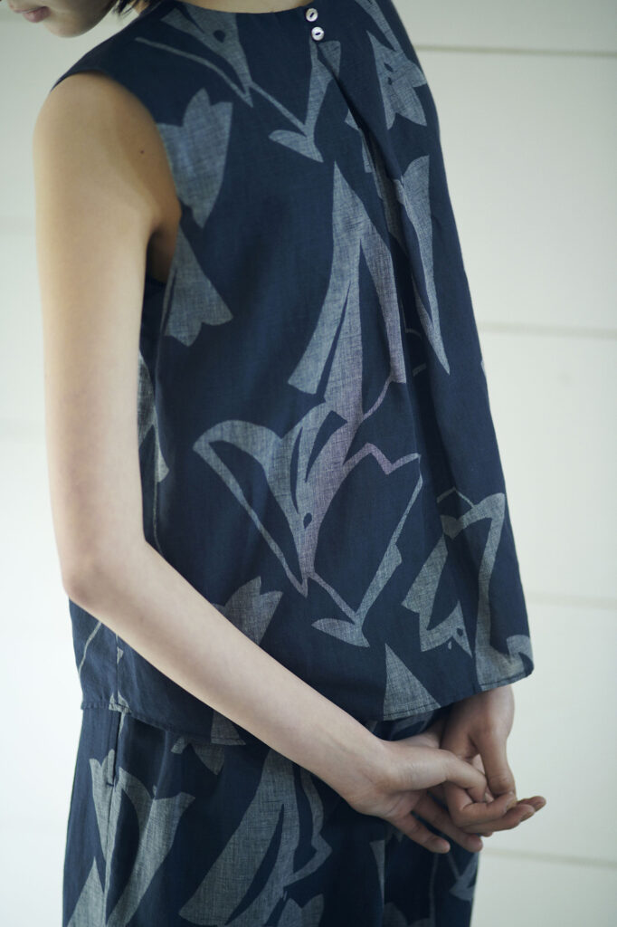 新潟県見附市で、日本で一軒のみ継承する貴重な技法『マンガン絣』を用いて誂えた、可憐なゆりの柄のシャツとパンツ。