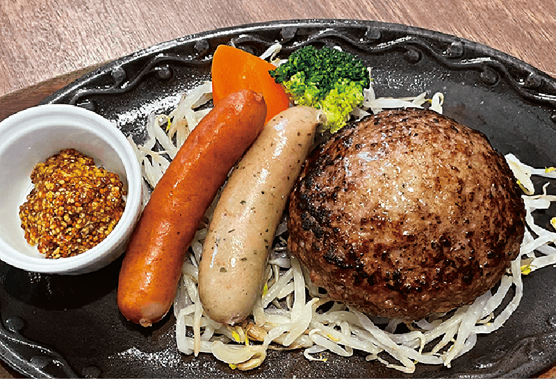 ジューシーなビーフ100%ハンバーグに個性の異なる2種のソーセージを添えた期間限定のメニューです。