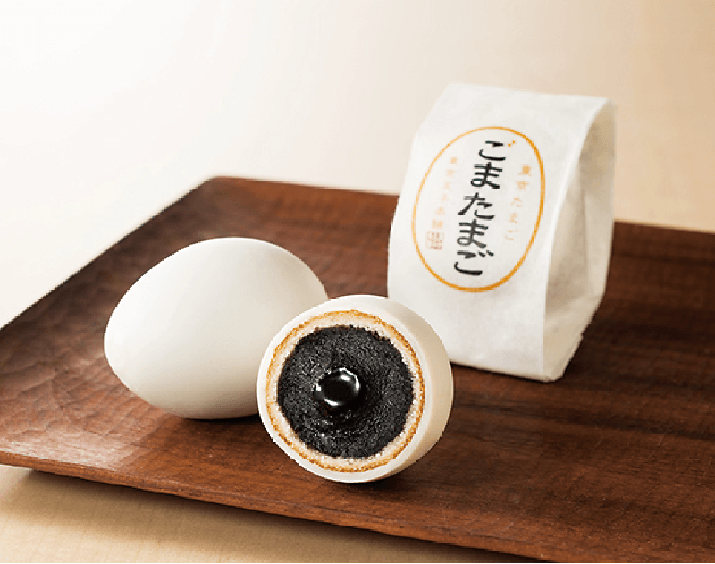 黒ごまのペーストと黒ごま餡をカステラ生地で包んでホワイトチョコでコーティングした、かわいいたまご型のお菓子です。